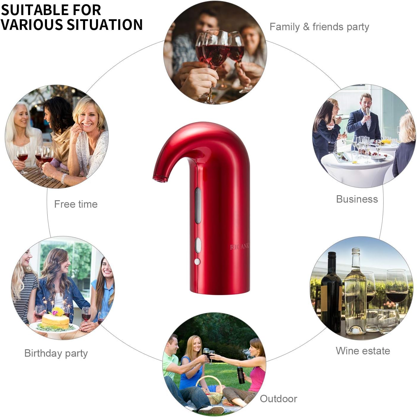 UNIWERSALNA KOMPATYBILNOŚĆ Z BUTELKAMI: Elastyczna rurka prowadząca i uniwersalny adapter bezproblemowo pasują do wszystkich standardowych butelek wina, zapewniając spójną jakość przy każdym nalewaniu.